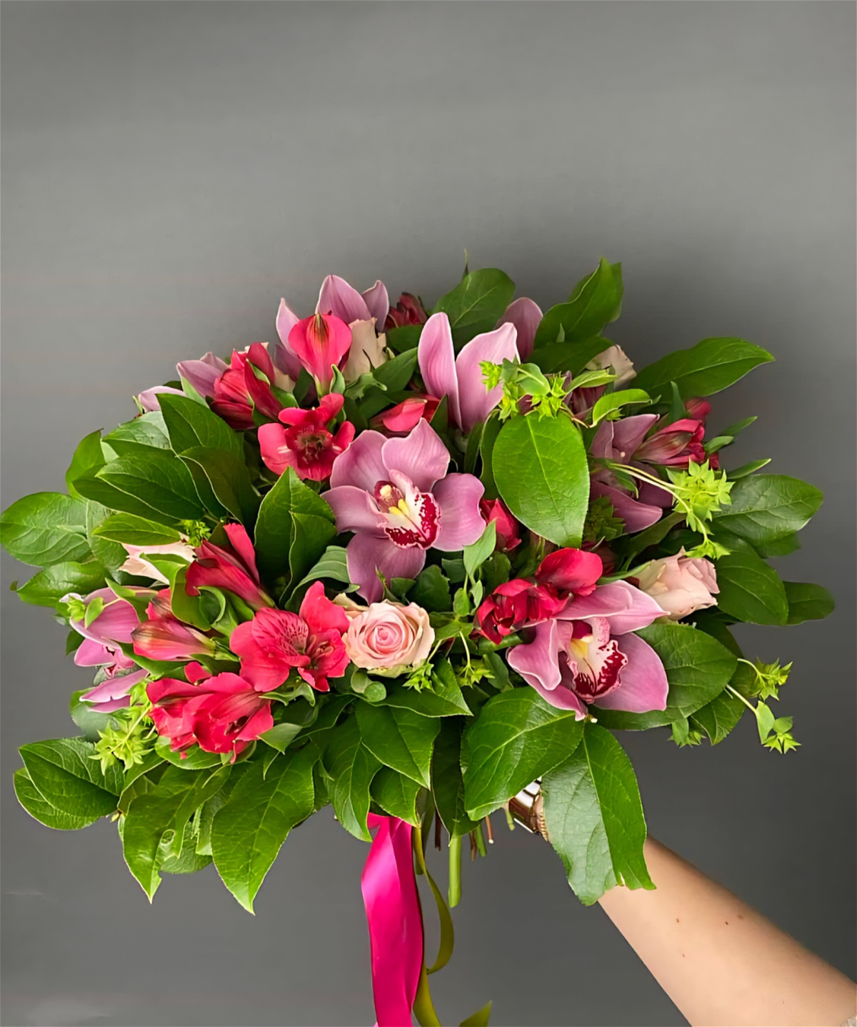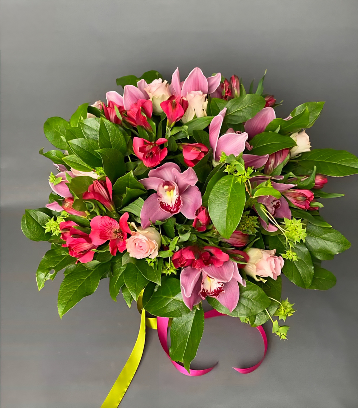 Brighten someone’s day with this lovely pink orchid and rose bouquet. This charming arrangement features exotic pink Cymbidium orchids mixed with delicate pink spray roses and vibrant Alstroemeria. Set against a backdrop of fresh, glossy green leaves, it is a wonderful way to bring a touch of the garden indoors.