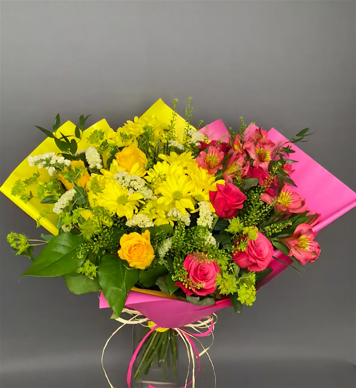 Hand-tied by our skilled florists, this fresh flower bouquet is a fantastic choice for a birthday surprise, a thank you gift, or a "just because" gesture. Wrapped in bold, dual-tone yellow and pink paper, it arrives ready to make an impact.