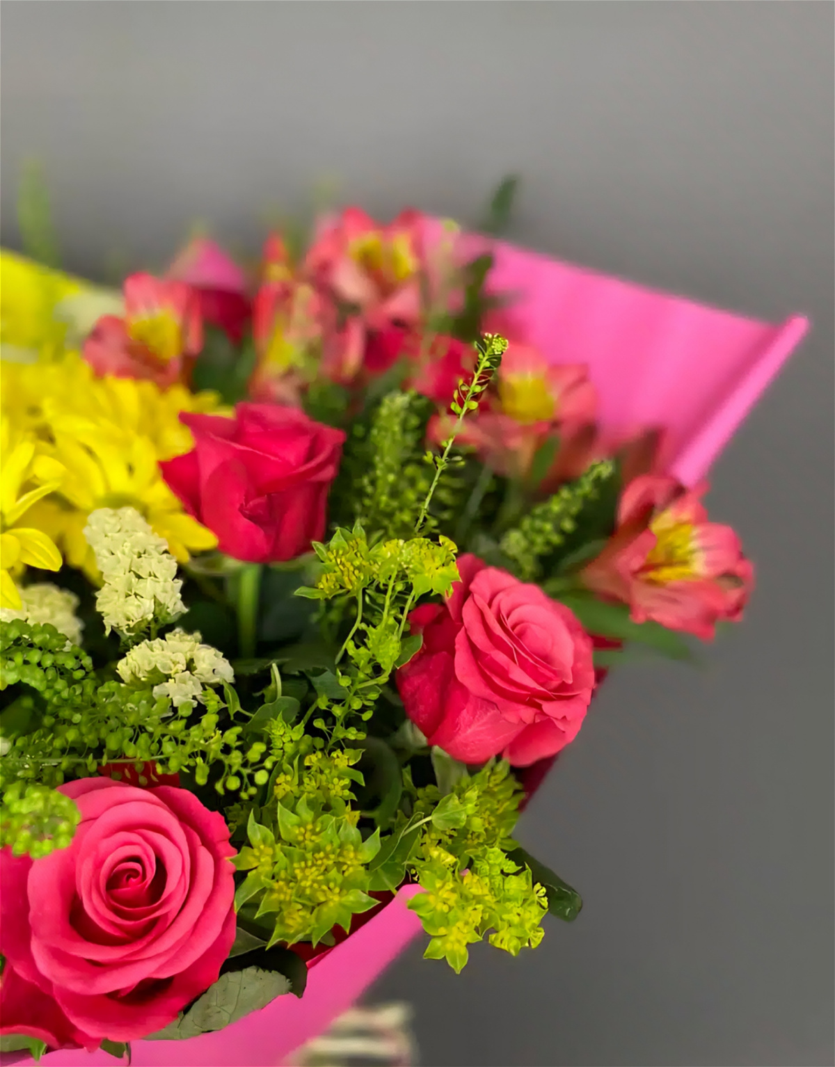 Bring a splash of sunshine to any room with our vibrant yellow and pink mixed bouquet. This cheerful arrangement combines bright yellow daisies and roses with striking hot pink roses and patterned alstroemeria. Accented with fresh green foliage and delicate white fillers, it is a high-energy display that radiates joy.